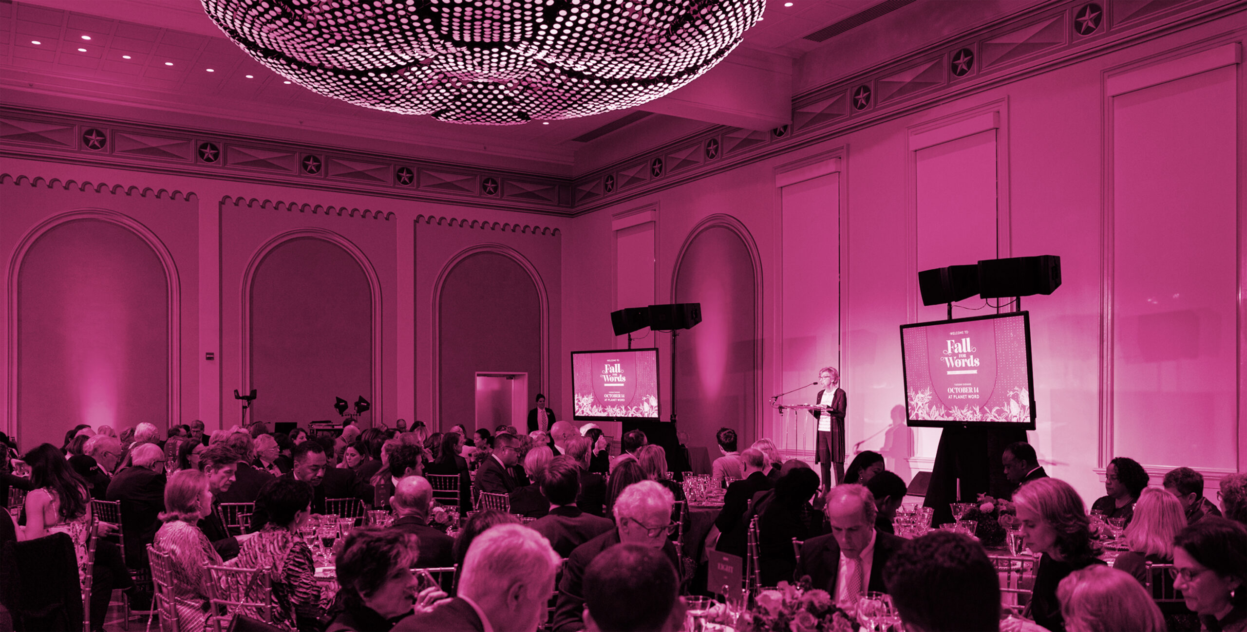 An event logo with customized typography was developed based on the theme "Fall for Words"—the double meaning of the fall evening for the event and the play on one's love of language. With the museum's branding in mind, a rich two-color palette was selected. Illustrative fall foliage and a pattern of twinkling dots and letterforms were introduced to create the illusion of falling words. As the invitee opened the invitation, it was removed from a die-cut enclosure. As they pulled the invite out from the enclosure, a gold foil backdrop is relieved through a die-cut pattern of circles that give the illusion of falling stars or leaves. In addition to the invitation, a suite of on-site materials was designed as a combination of tangible printed elements and digital graphics for presentations and signage.