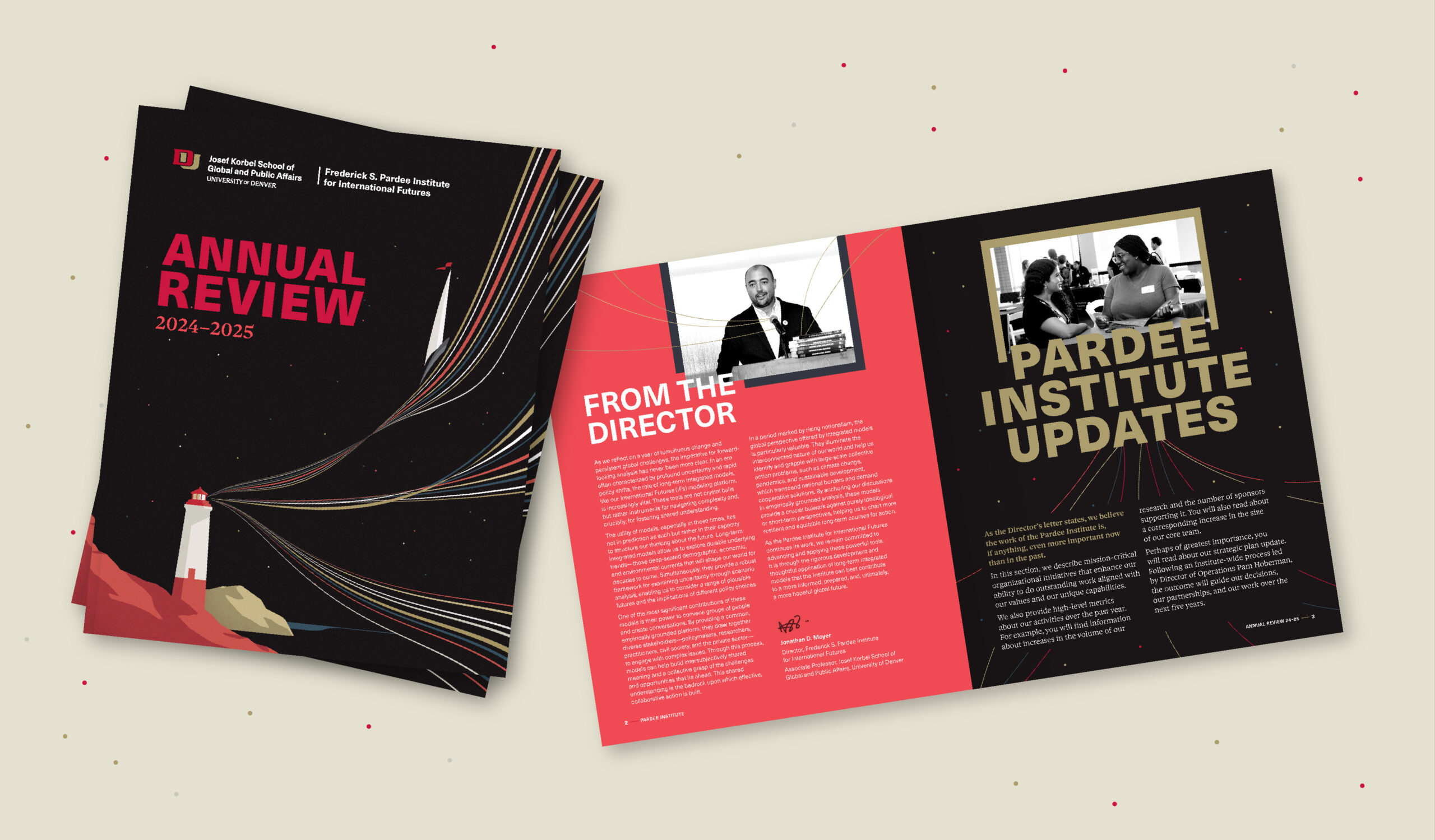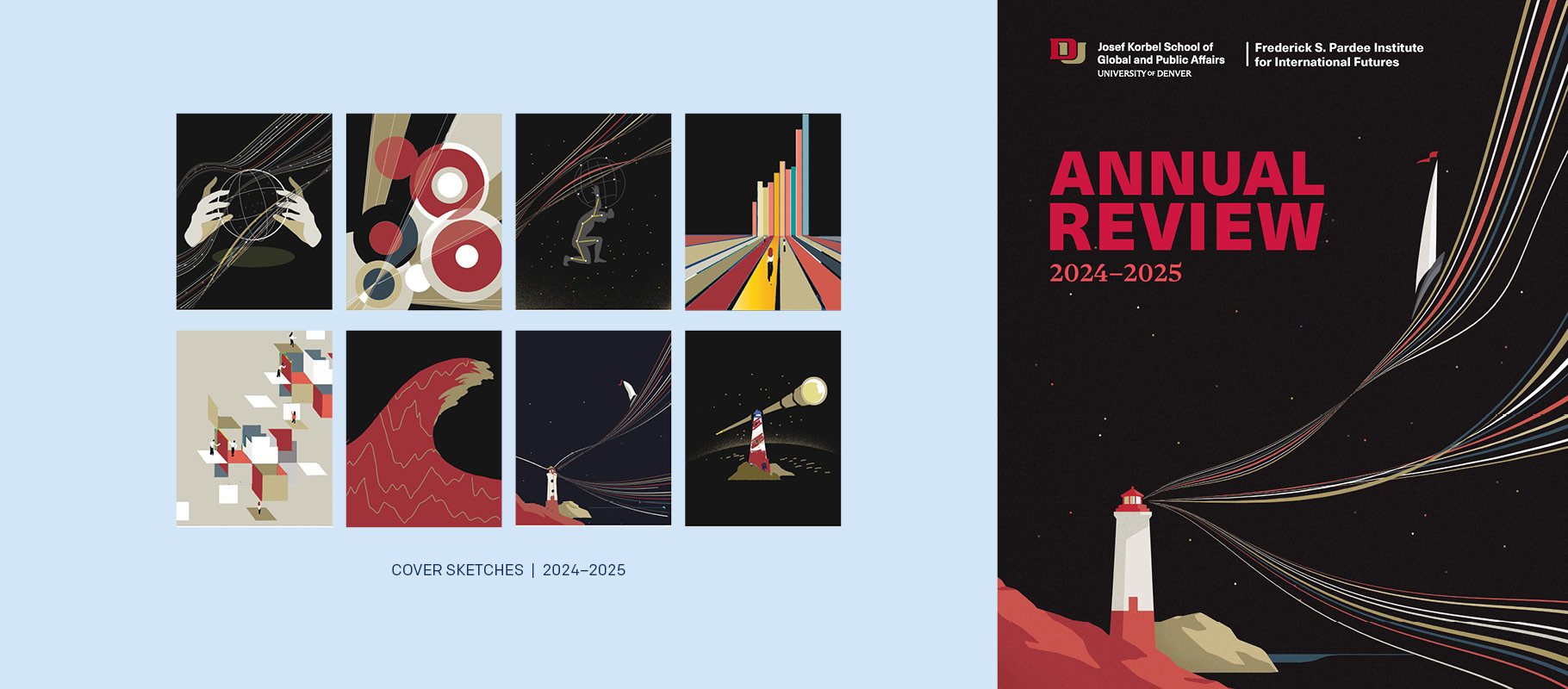 Building on the University of Denver's branding as the framework, the review was organized into sections that showcased the students, the research, and the breadth of Pardee's presence around the globe. After the success of the previous three years' illustrative covers, we again partnered with illustrator Chris Gash to create a unique, conceptual illustration. The illustration speaks to concepts of building knowledge and reducing uncertainty through a lighthouse motif, with its rays of light providing clarity for the boat. In the interior of the review, we continued with the rays of light and starry accents, a flexible grid for the Institute's varied content, and prioritized human-centric photography to highlight Pardee students, faculty, scholars, and events.