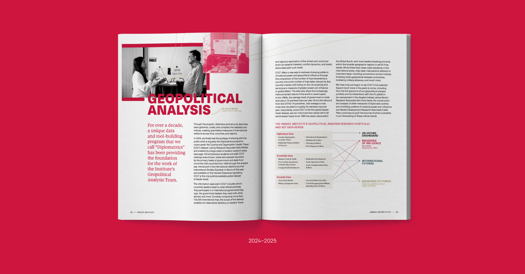 Building on the University of Denver's branding as the framework, the review was organized into sections that showcased the students, the research, and the breadth of Pardee's presence around the globe. After the success of the previous three years' illustrative covers, we again partnered with illustrator Chris Gash to create a unique, conceptual illustration. The illustration speaks to concepts of building knowledge and reducing uncertainty through a lighthouse motif, with its rays of light providing clarity for the boat. In the interior of the review, we continued with the rays of light and starry accents, a flexible grid for the Institute's varied content, and prioritized human-centric photography to highlight Pardee students, faculty, scholars, and events.