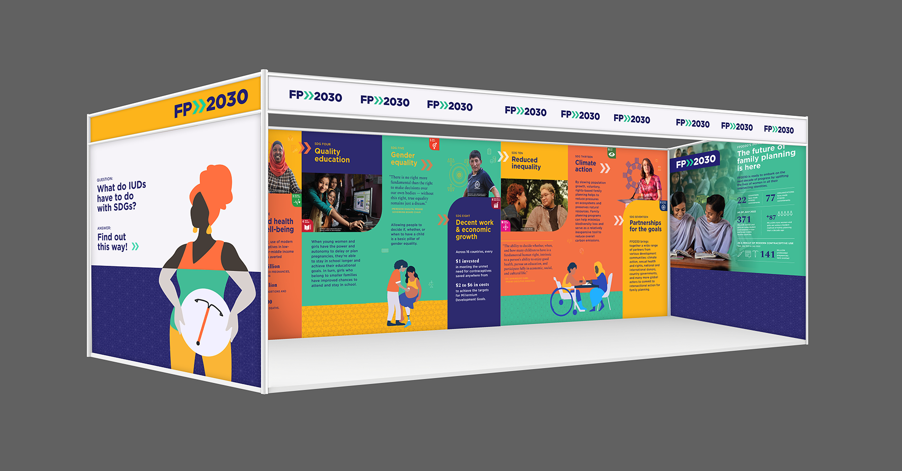 Utilizing FP2030's branding and its illustration and photo library, we created an exterior wall panel to entice participants to turn the corner into FP2030's booth. The expansive back wall of the booth showcased FP2030's role in achieving nine of the UN’s sustainable development goals. The left side featured a photo wall backdrop encouraging people to commit to assisting FP2030's goals, and the right end of the space highlighted FP2030's impact. The booth also included seating for impromptu meetings and conversations, family planning-related games, and giveaways.