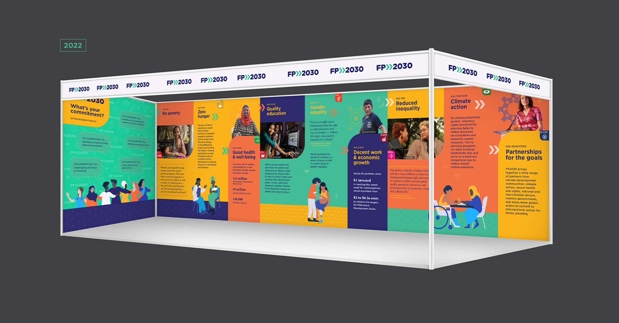 Utilizing FP2030's branding and its illustration and photo library, we created an exterior wall panel to entice participants to turn the corner into FP2030's booth. The expansive back wall of the booth showcased FP2030's role in achieving nine of the UN’s sustainable development goals. The left side featured a photo wall backdrop encouraging people to commit to assisting FP2030's goals, and the right end of the space highlighted FP2030's impact. The booth also included seating for impromptu meetings and conversations, family planning-related games, and giveaways.