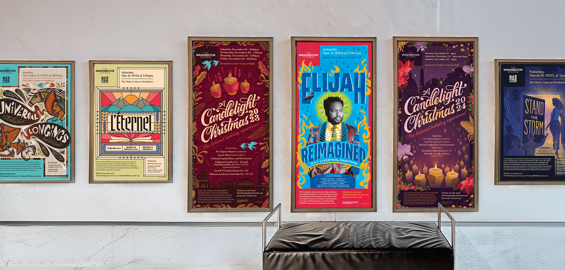 Every year, music lovers from around the world look forward to the unveiling of The Washington Chorus’ concert lineup for the forthcoming season. Renowned as one of the foremost symphonic choruses in the nation, TWC envisions an inclusive community where choral music connects, reflects, and inspires everyone. Eighty2degrees has partnered with TWC for multiple concert series to create unique suites of posters to promote the wide-ranging events.